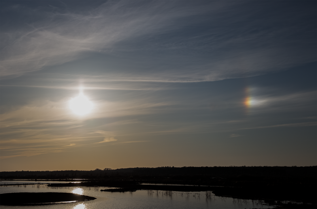 Am 30.03.2021 zeigte sich gegen 17.45 Uhr ein leichtes Sonnenhalo mit einer sehr deutlichen rechten Nebensonne. Nur wenige Minuten später wurde sie etwas schwächer, aber dafür bildete sich eine sehr schöne linke Nebensonne aus, so dass kurzzeitig die Sonne mit beiden Nebensonnen, sowie auf der linken Seite leicht der Ansatz des Horizontalkreises sichtbar war. Das Ganze dauerte ca. 15 Minuten. Die Aufnahmen entstanden im Himmelmoor in der Nähe von Quickborn.