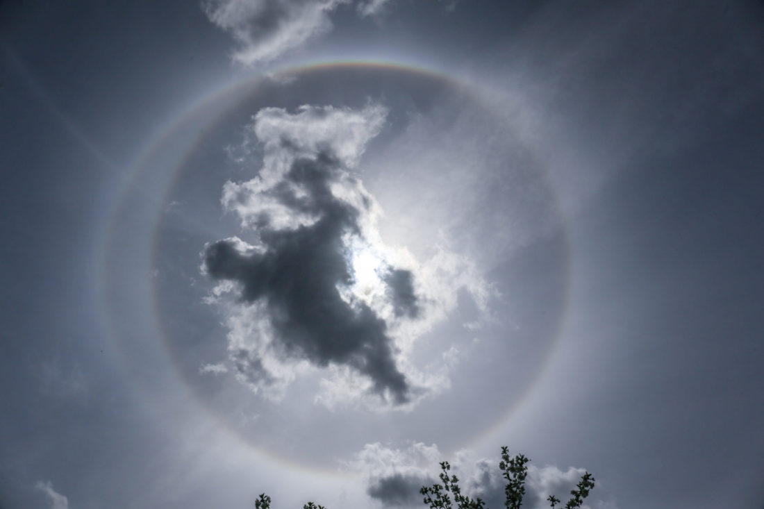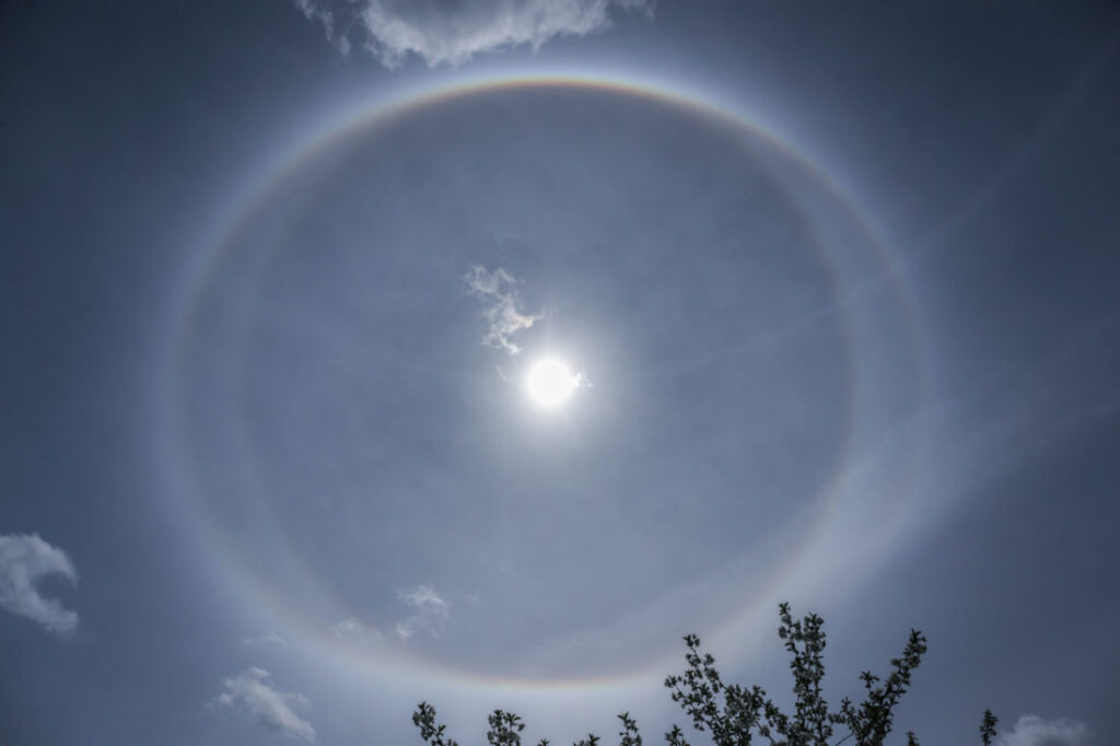 Sonnenhalo (22° Ring) mit umschriebenen Halo und Horizontalkreis, aufgenommen am 08.05.2021 gegen 13 Uhr in Tornesch mit Canon 6D, manuell, 24mm, 1/1600s, Blende 11, ISO 100, Bild 1 als Infrarotdarstellung. Aufnahmen: Peter Zemlin