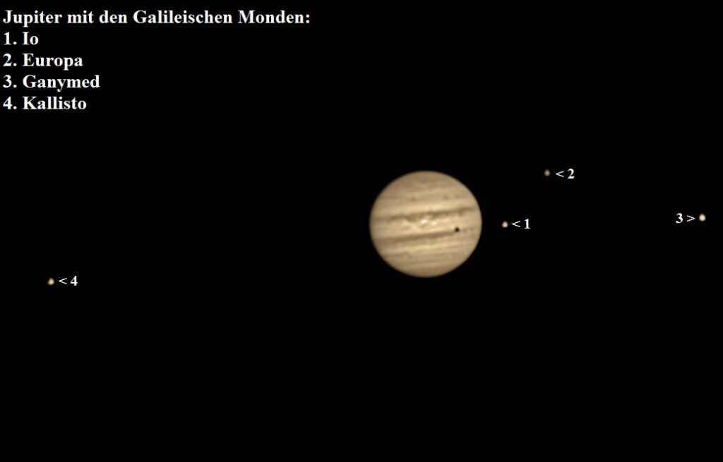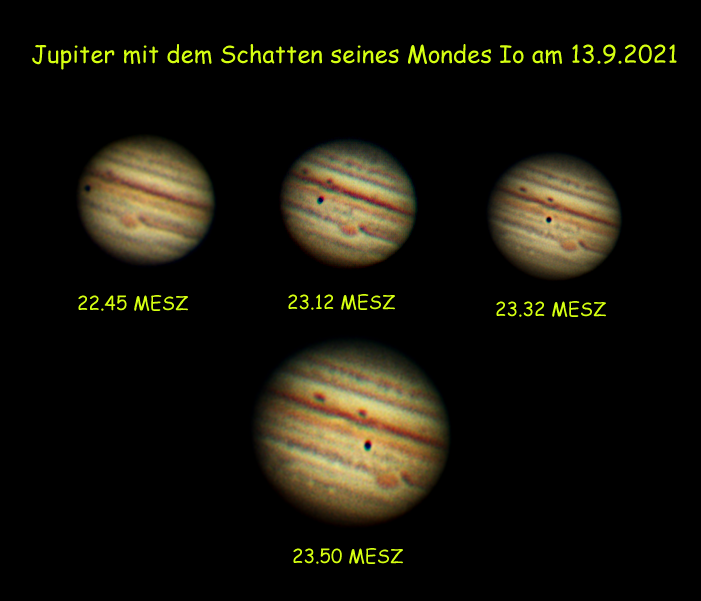 Kein Planet bietet dem Astro- Amateur so viele Details wie der Gasriese Jupiter mit seinen Wolkenbändern und Wolkenwirbeln, bei denen es immer wieder Veränderungen gibt. Markantestes „Objekt“ ist der Große Rote Fleck (GRF), ein gigantisches Wirbelsturmgebiet, welches schon seit über 300 Jahren beobachtet wird. Zu der schnellen Rotation von 9h55min30s um die eigene Achse kommt noch das Wechselspiel der vier größten Jupitermonde Io, Europa, Ganymed und Callisto hinzu, die Jupiter in unterschiedlichen Entfernungen umkreisen und dabei von Zeit zu Zeit ihre Schatten (im Sonnenlicht) auf die Jupiteroberfläche werfen. So hatte der Fotograf am 13.9.21 das Glück bei einer guten Sicht auf die Jupiterscheibe nicht nur den GRF, sondern auch einen Mondschatten anzutreffen und deren Bewegungen auf einer Reihe von Fotos festzuhalten. Die Recherche ergab, dass der Schatten vom Io stammte. Io ist von den „Vier“ dem Jupiter am nächsten und umrundet ihn in 400 000 km Entfernung, vergleichbar dem Abstand von Erdmond und Erde. Auch in der Masse unterscheiden sich die beiden Monde nur wenig. Während aber der Erdmond die Erde in knapp einen Monat umkreist, bleiben Io nicht einmal zwei Tage für eine Umrundung, um der gewaltigen Anziehungskraft des Jupiter (gut das Dreihundertfache der Erde) standzuhalten.