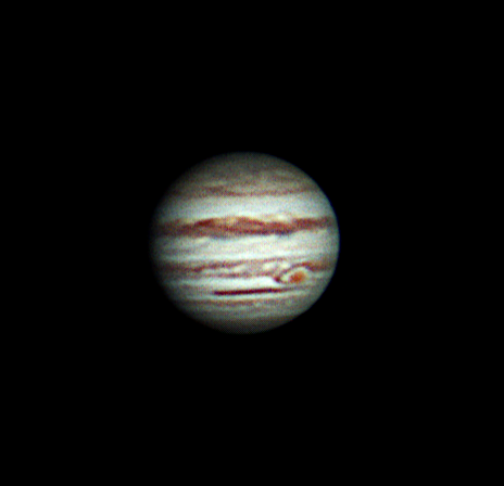 Jupiter vom 14.04.2016, aufgenommen in der Dachfenster-Sternwarte Elmshorn mit einem ED Refraktor 120/900, 3fach Barlow, mit einer ZWO ASI 120 MC