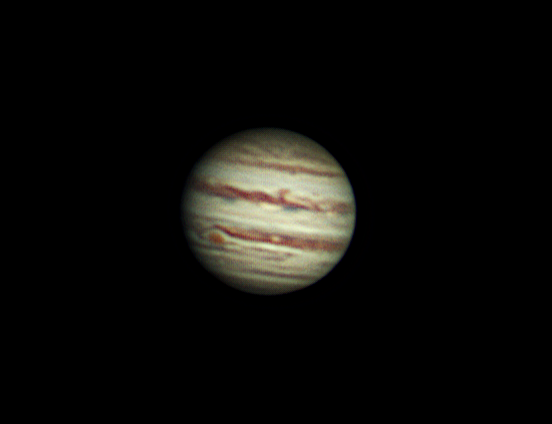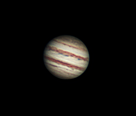 Jupiter, aufgenommen am 10.03.2016 in der Sternwarte Tornesch mit einem C-14 von Celestron 356/3910, Stacking von Videoaufnahme, Kamera: DMK41, Foto eingefärbt