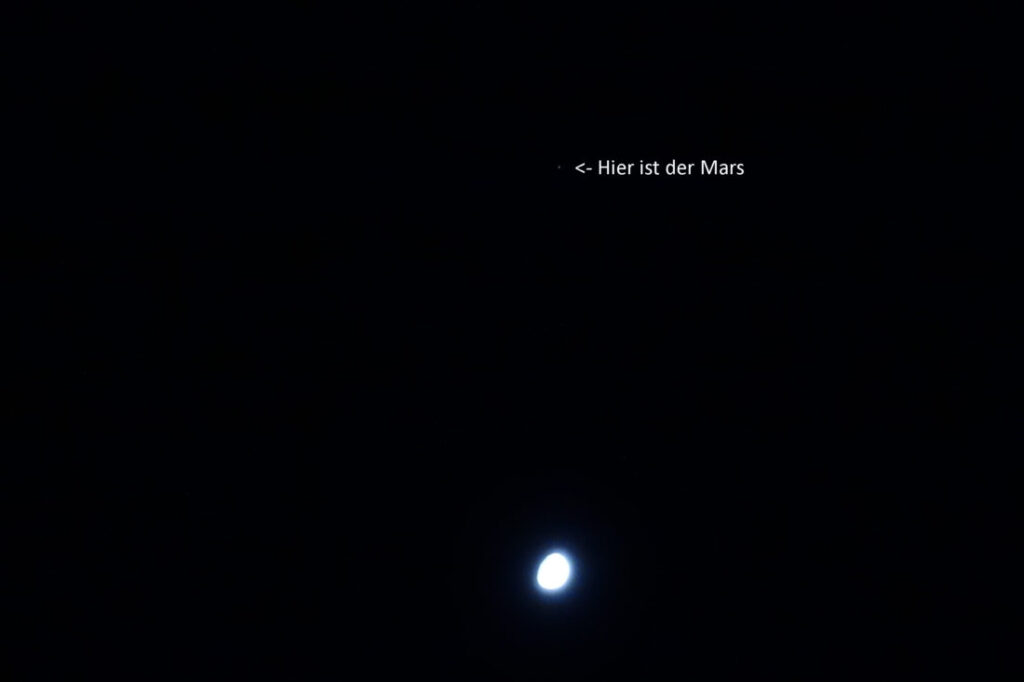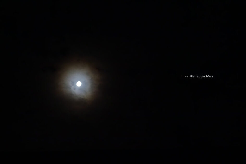 Konstellation Mond und Mars am Abendhimmel des 26.11.2020, aufgenommen mit viel Geduld durch eine Wolkenlücken