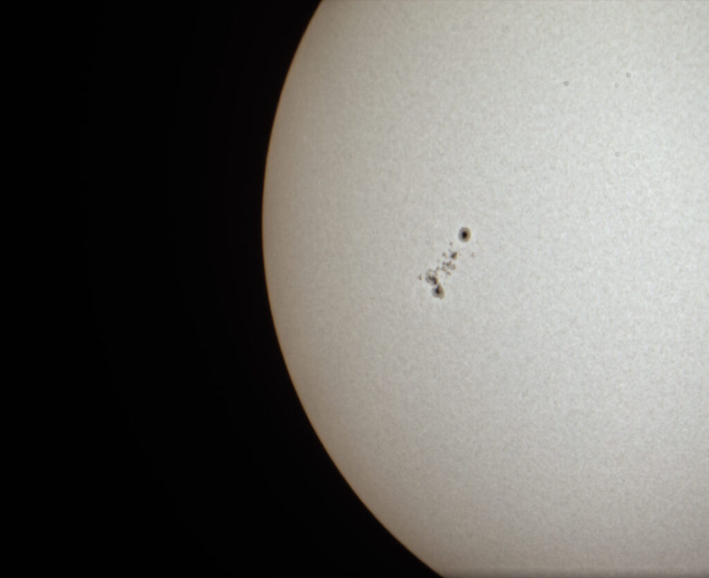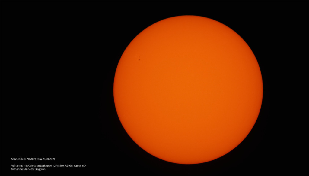 Kleine Sonnenfleckengruppe AR2859, aufgenommen am 23.08.2021 in Pinneberg mit einem Celestron Maksutov 127/1500, Astrozap Sonnenfilter, Canon 6D auf einer AZ-Gti