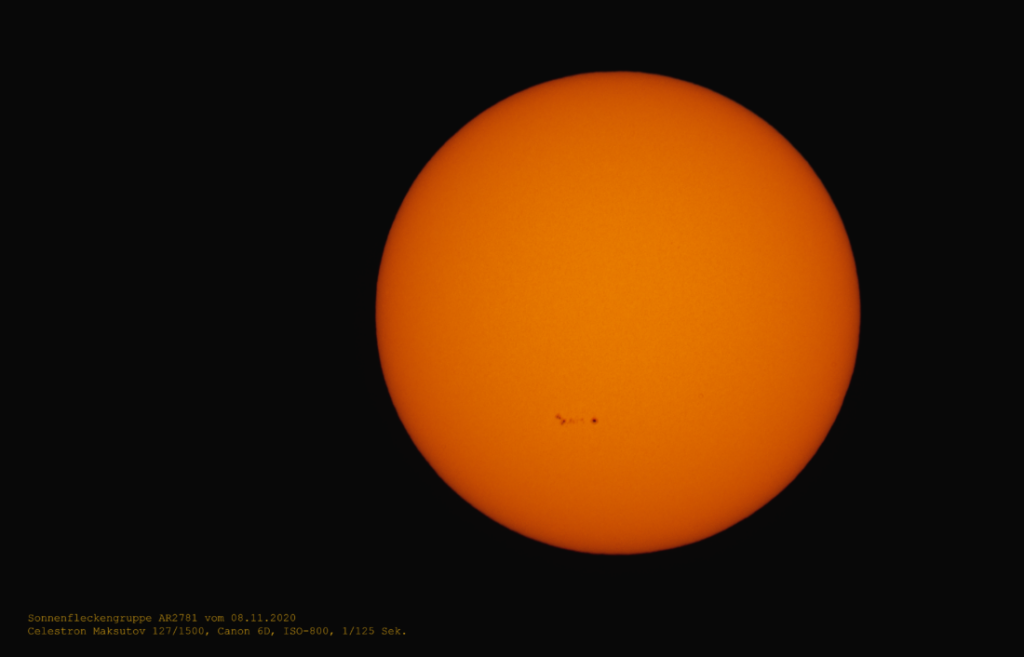 Sonnenfleckengruppe AR2781 vom 08.11.2020 aufgenommen mit einem Celestron Maksutov 127/1500 und Canon 6D in der Sternwarte Tornesch