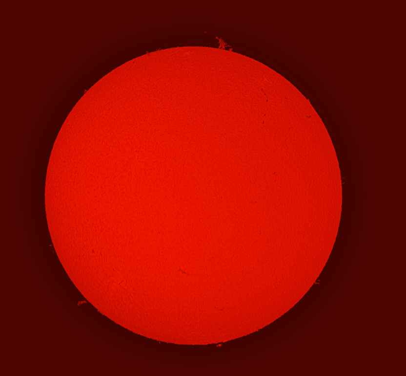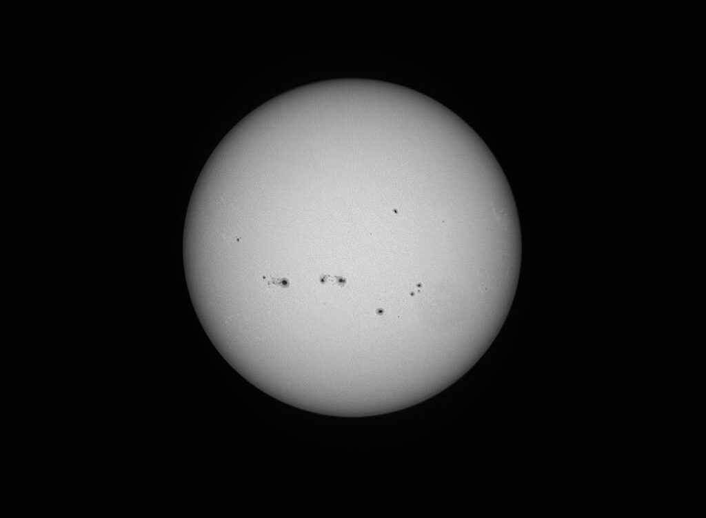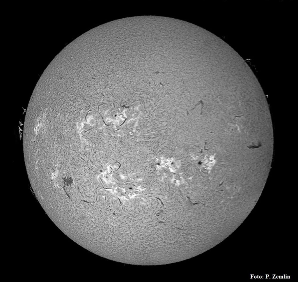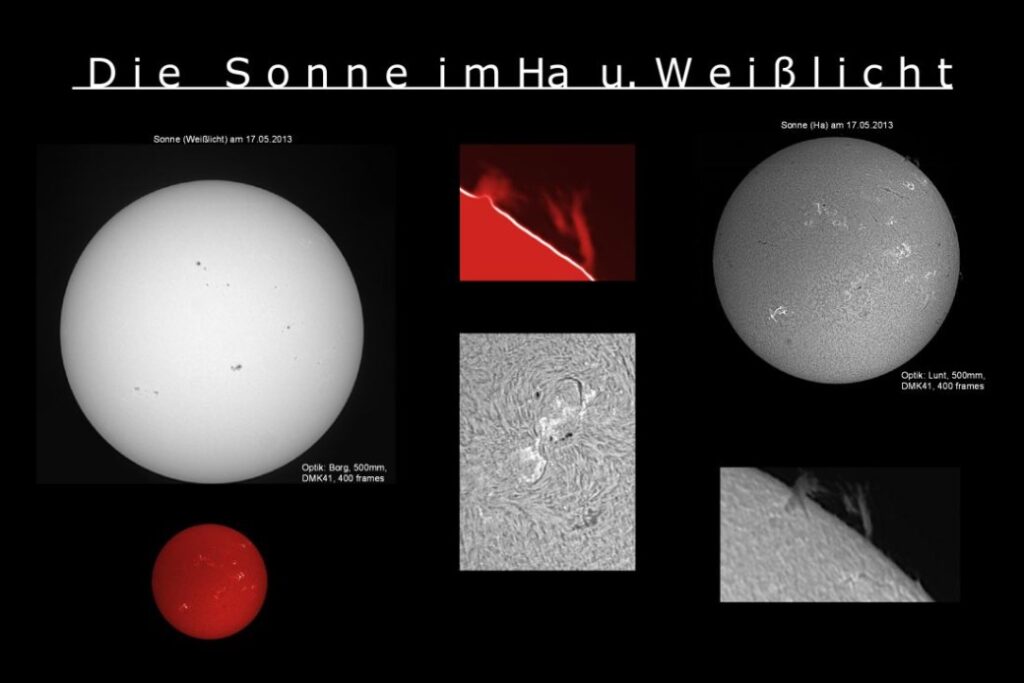 Auf dem Foto im Weißlicht kann man viele Sonnenflecken erkennen. Um die Sonnenflecken herum gibt es starke Aktivitätsgebiete. Das ist auf dem Bild darunter (im H-Alpha-Licht) sehr gut zu sehen.
