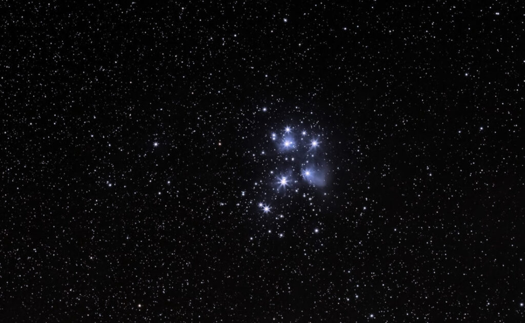 Plejaden M45 vom 05.10.2018, Gesamtbelichtungszeit 30 Minuten, Canon EOS 1200d, 135 mm, ISO 1600, 30 x 60 Sek.