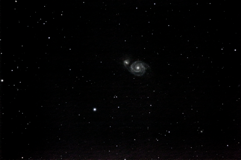 Whirlpoolgalaxie im Sternbild Jagdhunde (M51) , aufgenommen am 15.04.2020 in der Dachfenster-Sternwarte Elmshorn mit einem ED Refraktor 120/900, Canon EOS, 20 x 20 Sek., gestackt mit DSS, Nachbearbeitung in Gimp