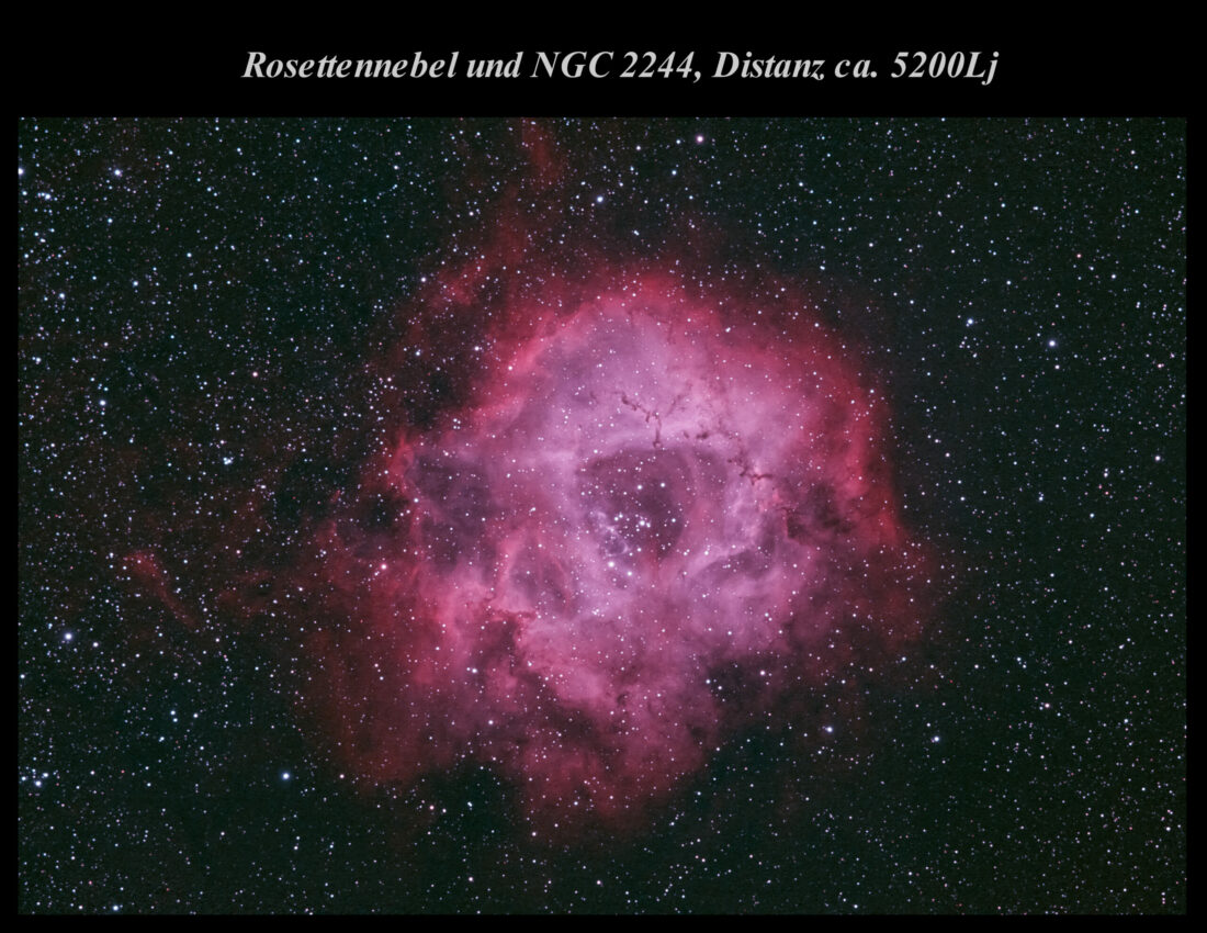 Der Rosettennebel (NGC 2237) mit dem offener Sternhaufen NGC 2244, aufgenommen am 26.02. und 28.02.202 in der Sternwarte Tornesch.