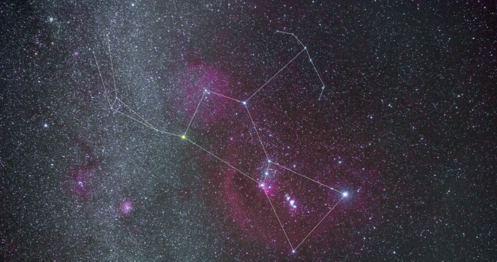 Der Orion – mythischer Himmelsjäger, ist ein markantes und faszinierendes Sternbild des Wintersternhimmels, leicht auffindbar durch die drei Gürtelsterne. Die Sterne Beteigeuze (u.a. Bestandteil des Winterdreiecks) sowie Bellatrix (Eckpunkt des Wintersechsecks) bilden die Schulter und die Sterne Rigel (Eckpunkt des Wintersechsecks) und Saiph die Füße des Orions. Die Gürtelsterne Alnitak, Alnilam und Mintaka werden auch die drei Könige oder Jakobsleiter genannt. Im Sternbild Orion befindet sich, der auch mit bloßem Auge sichtbare Orionnebel (M42), der seine ganze Farbpracht jedoch erst durch Langzeitbelichtungen zeigt. Auf dem Foto wird durch die Langzeitbelichtung auch der große Emissionsnebel Barnard’s Loop bzw. Sh2-276, der sich über das gesamte Sternbild erstreckt, sichtbar. Er zieht sich entlang nördlich der Gürtelsterne als fast halbkreisförmiger Bogen bis hinunter zu den markenten Sternen Saiph und Rigel. Der Orion ist noch bis Mitte April am Abendhimmel beobachtbar.