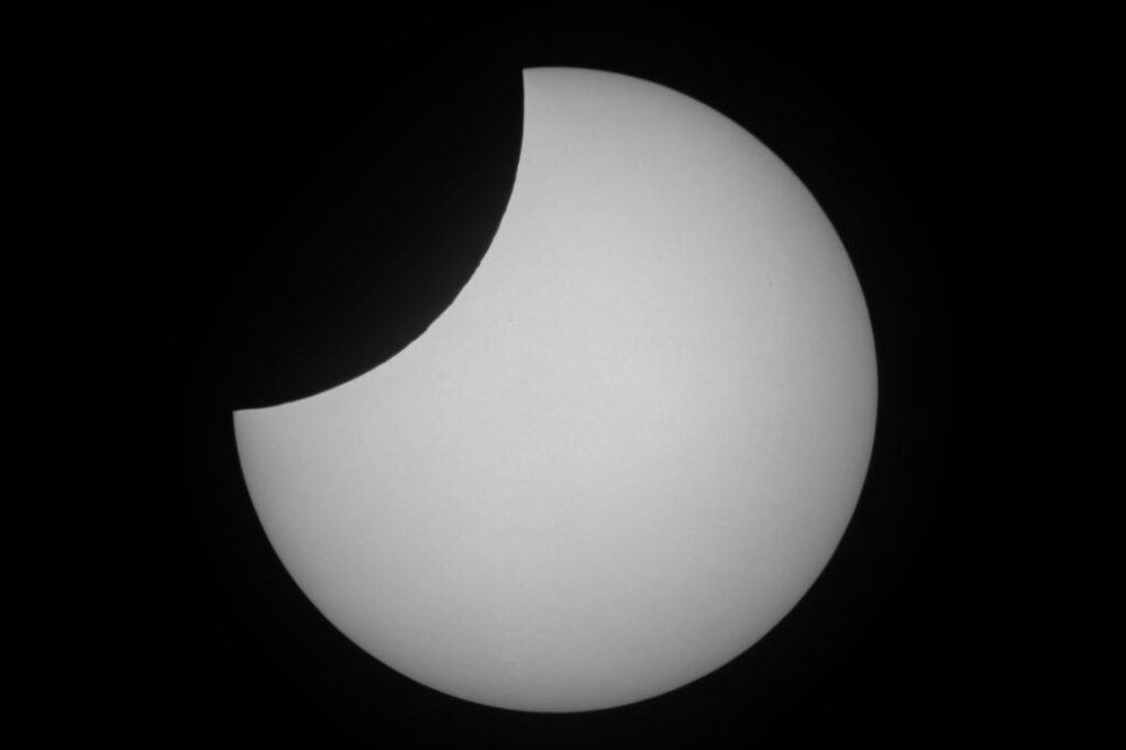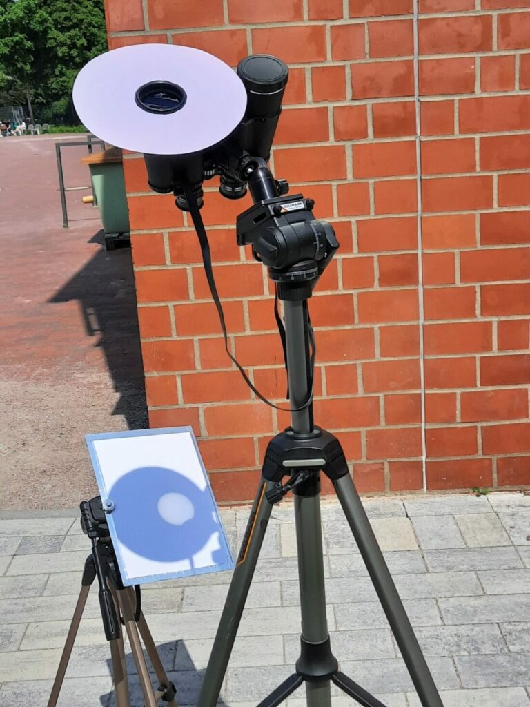 Am 10. Juni dieses Jahres gab es wieder eine partielle Sonnenfinsternis zu bestaunen: Am Elsensee Gymnasium in Quickborn, wo ich eine Astro-AG leite, konnnte man auf dem Schulhof das Ereignis gefahrlos verfolgen. Dies wurde möglich durch die Projektion der Sonne per Fernglas auf einen weißen Schirm – beide zueinander ausgerichtet und von Zeit zu Zeit per Hand korrigiert.