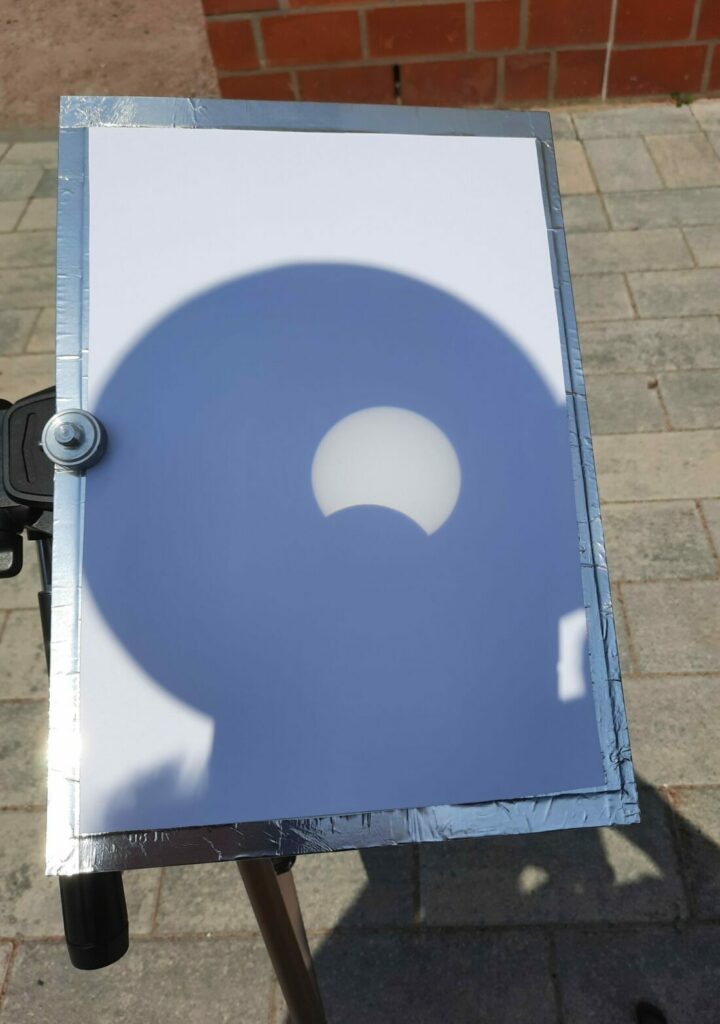 So konnten gleichzeitig viele Schülerinnen und Schüler den Verlauf beobachten, was mit Teleskop und Sonnenfilter wegen der Coronamaßnahmen nicht möglich gewesen wäre. Und sie kamen zahlreich, waren interessiert, neugierig und erstaunt zu erfahren, dass der Mond einen Teil der Sonne verdunkeln konnte.
