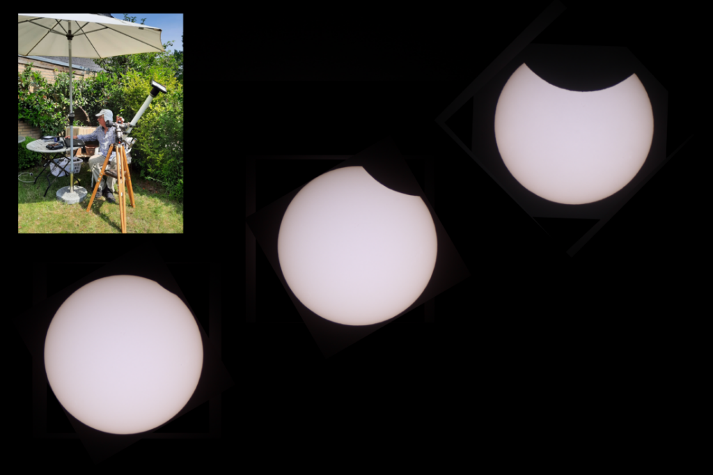 Die Fotokollage zeigt die Finsternis um 11.35 Uhr (kurz nach dem ersten Kontakt), um 11.45 Uhr und um 12.35 Uhr (maximale Bedeckung) und den Fotografen bei der „Arbeit im Garten“. Arbeitsgeräte: Kamera (Canon EOS), Refraktor (60/900) mit Objektiv-Solarfolie, parallaktische Montierung mit manueller Nachführung und PC zur Aufnahmesteuerung.