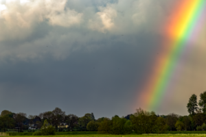Regenbögen entstehen, wenn Sonnenlicht in Regentropfen gebrochen, reflektiert und erneut gebrochen wird. Das Licht wird dabei in seine Spektralfarben zerlegt, wodurch der typische farbige Bogen entsteht. Für Astrofotografen sind Regenbögen zwar kein klassisches Motiv, aber sie bieten eine großartige Gelegenheit für atmosphärische Aufnahmen – besonders in Kombination mit Landschaften oder dramatischen Wolkenformationen. Besonders spektakulär sind doppelte Regenbögen. Dabei ist der Hauptregenbogen (Primärbogen) innen violett und außen rot, beim zweiten Regenbogen (Sekundärbogen) ist es genau umgekehrt. Dies kommt dadurch zustande, dass das einfallende Licht gegenüber dem Primärbogen ein weiteres mal reflektiert wird. Der Sekundärbogen ist dabei immer auch etwas schwächer.