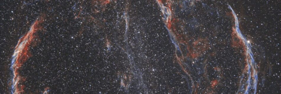 Übersichtsaufnahme vom Cirrusnebel oder auch Schleiernebel genannt im Sternbild Schwan. Aufnahmedetails: 20 Lights à 4min mit L-extreme, 16 Darks à 4min. mit einem Apo 432mm F6, Guiding. Daraus wurde mit APP ein Falschfarbenbild erstellt, nachbearbeitet mit LR. Aufgenommen am 21.09.2022, Aufnahme: Peter Zemlin