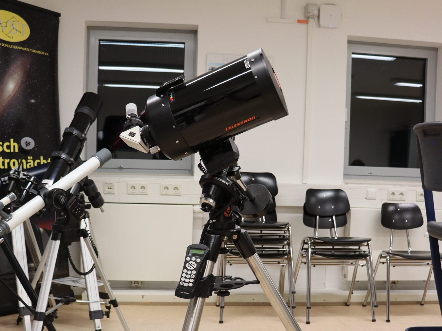 Im Vortragsraum in der Klaus-Groth Schule Tornesch finden unsere Astronächte und kleinere Veranstaltungen statt. Er liegt direkt an der Sternwarte, sodass im Rahmen der Astronächte bei entsprechendem Wetter geführte Beobachtungen stattfinden.